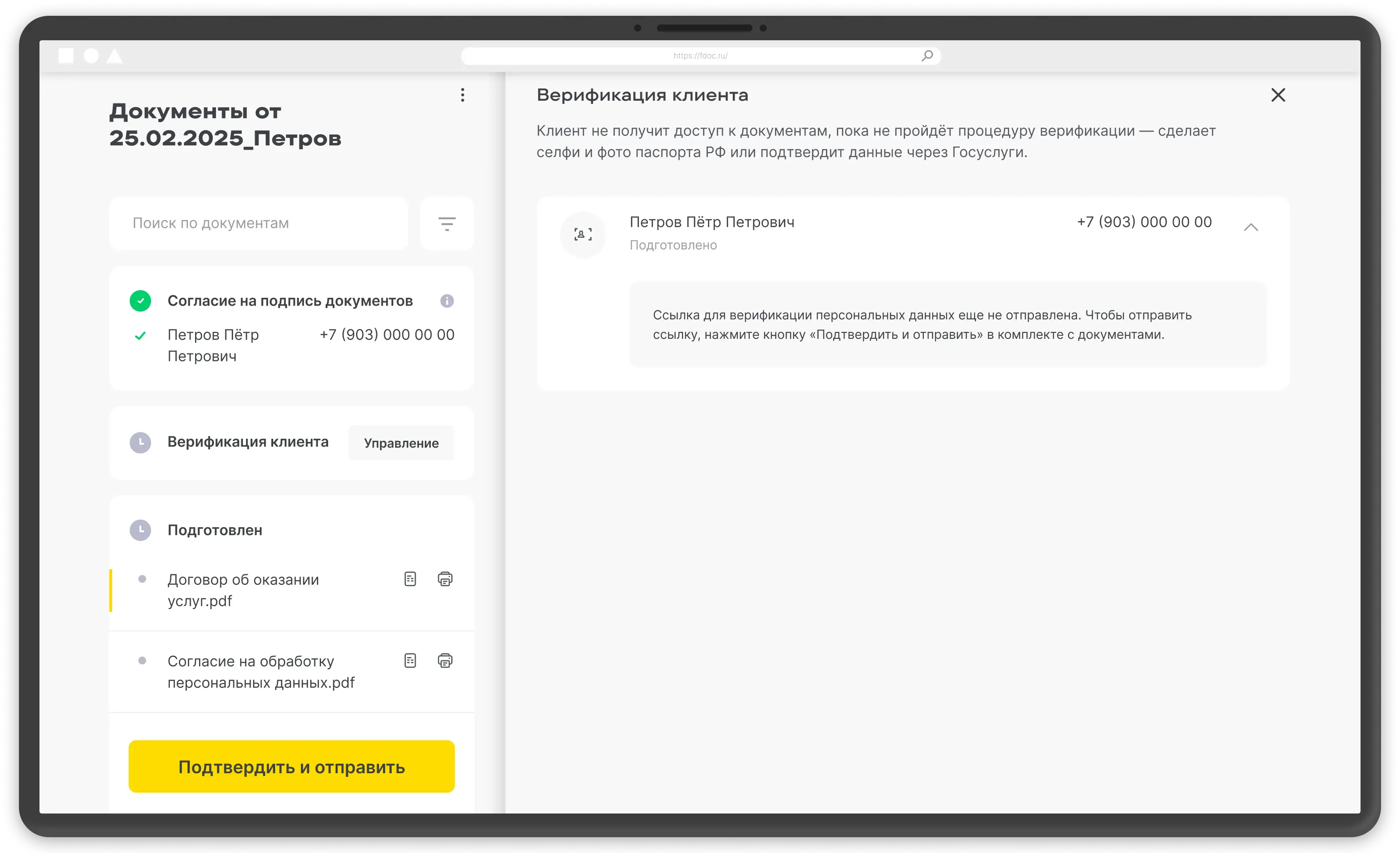 У клиента не будет доступа к электронным документам, пока он не сделает селфи и фото паспорта и не отправит их. Инструкции, отправленные из личного кабинета F.Doc, помогут ему правильно пройти верификацию.