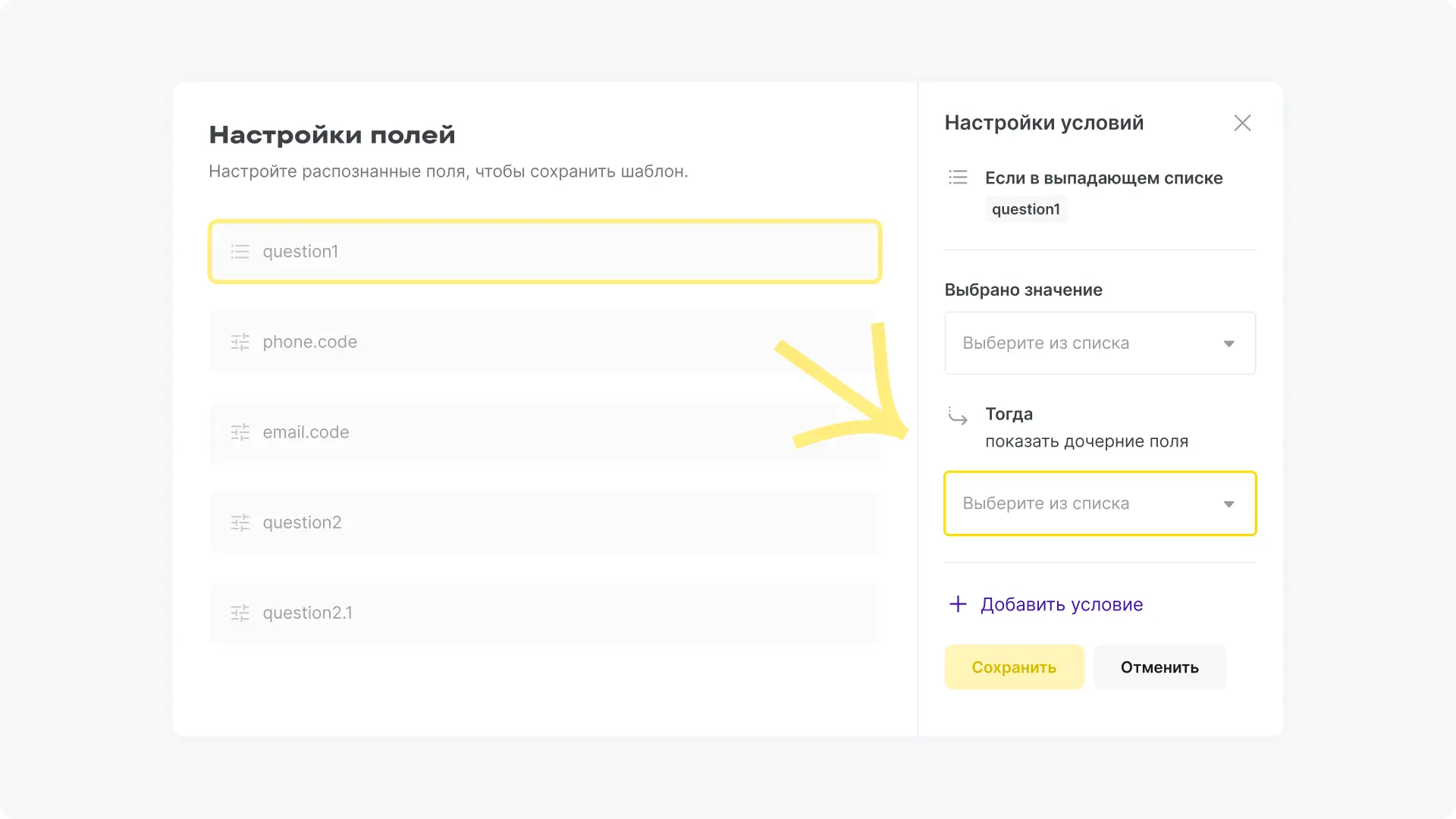 Поле, для которого настраиваются условия, является родительским вопросом. Вопросы, которые отображаются в зависимости от выбранного ответа, — дочерние вопросы.