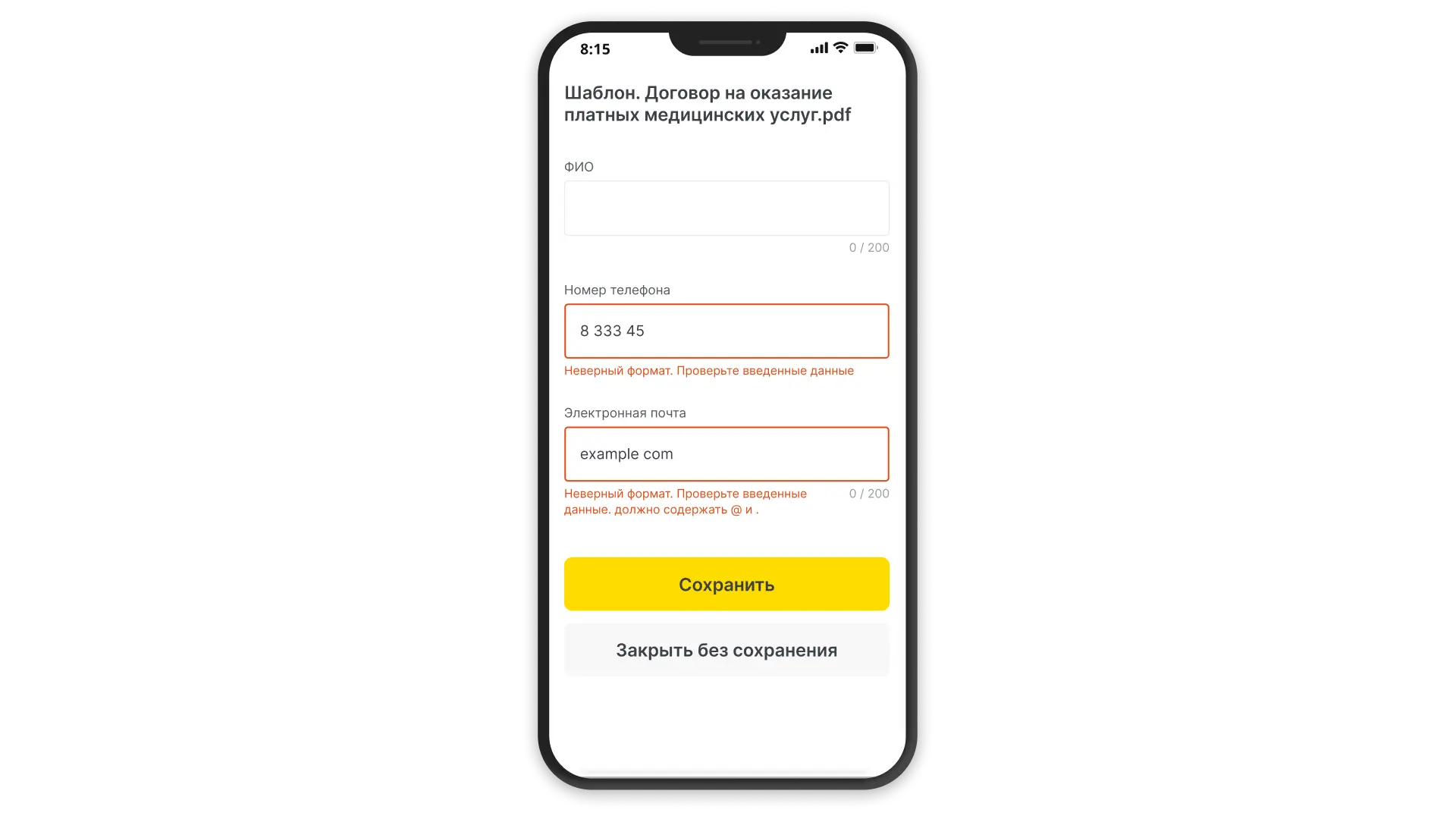 Теперь при заполнении шаблонов документов клиентом или сотрудником F.Doc автоматически проверяет формат введенных данных. Это помогает избежать ошибок и не заполнять документы заново.