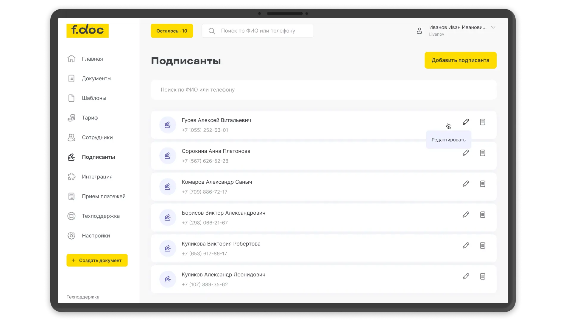 В разделе «Подписанты» личного кабинета появилась кнопка «Редактировать», с помощью которой можно изменить ФИО или номер телефона клиента-подписанта.
