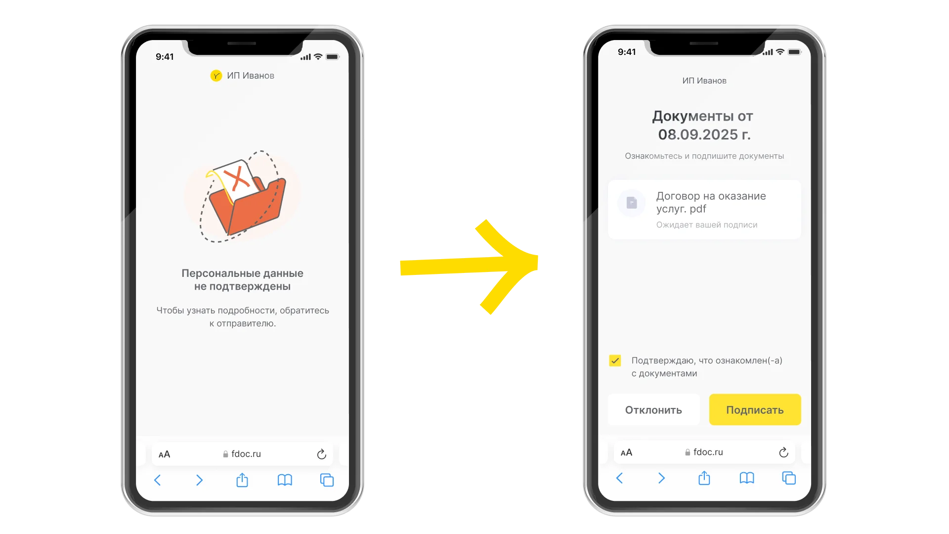 Теперь при ручном подтверждении данных при верификации страница у клиента обновляется автоматически, и документы сразу становятся доступны для подписания. Клиенту не нужно вручную обновлять страницу.