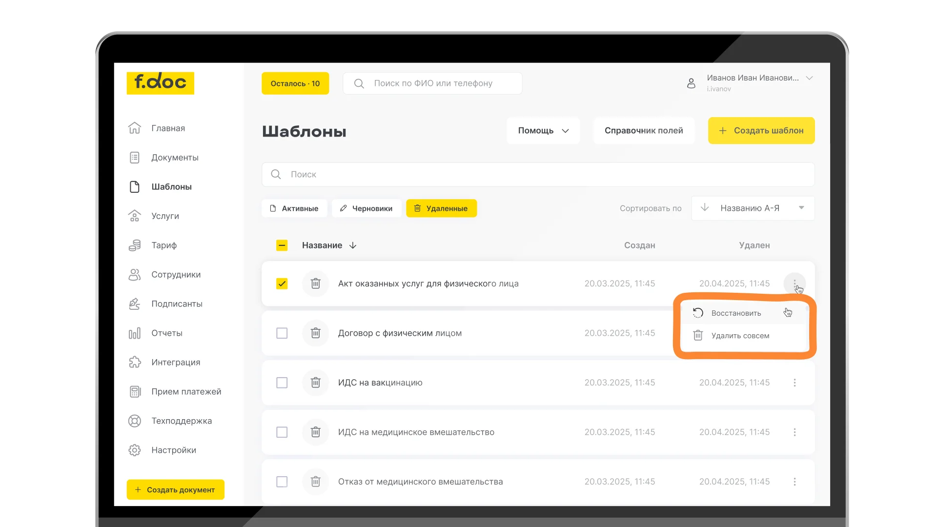 В разделе «Шаблоны» появилась новая вкладка «Удаленные», где доступны все шаблоны и черновики, перенесенные в корзину. Оттуда их можно восстановить для дальнейшей работы или удалить окончательно.