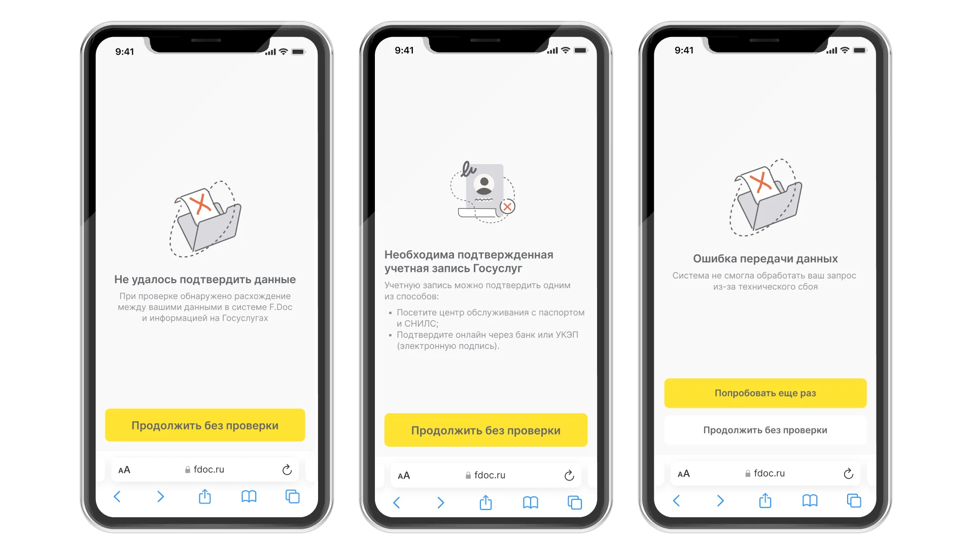 Если подписание ИДС запланировано в кабинете врача или на бумаге, то при подписании документов на ресепшене пациент может пропустить шаг авторизации в ЕСИА, нажав кнопку «Продолжить без проверки».