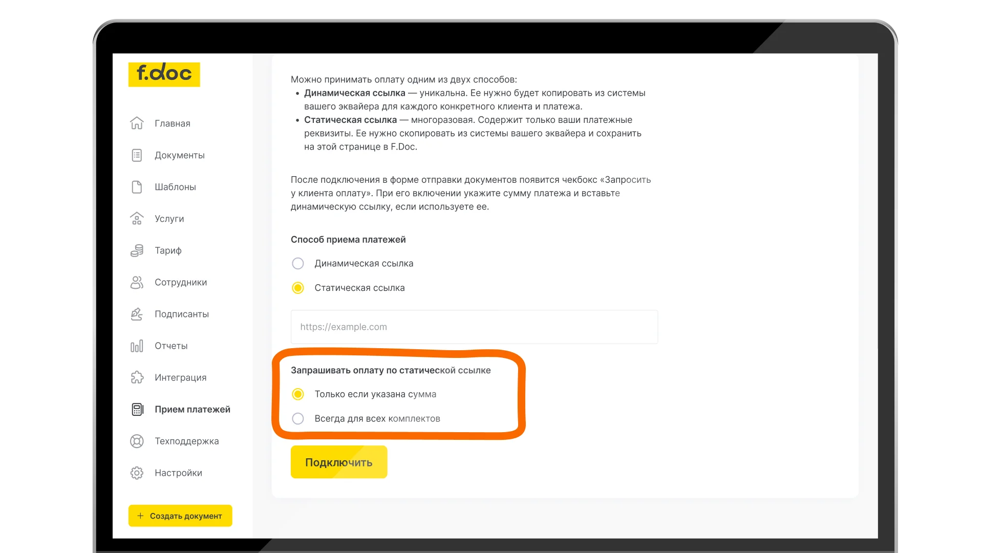 - «Всегда для всех комплектов» — оплата по статической ссылке будет предлагаться подписанту даже без передачи суммы.