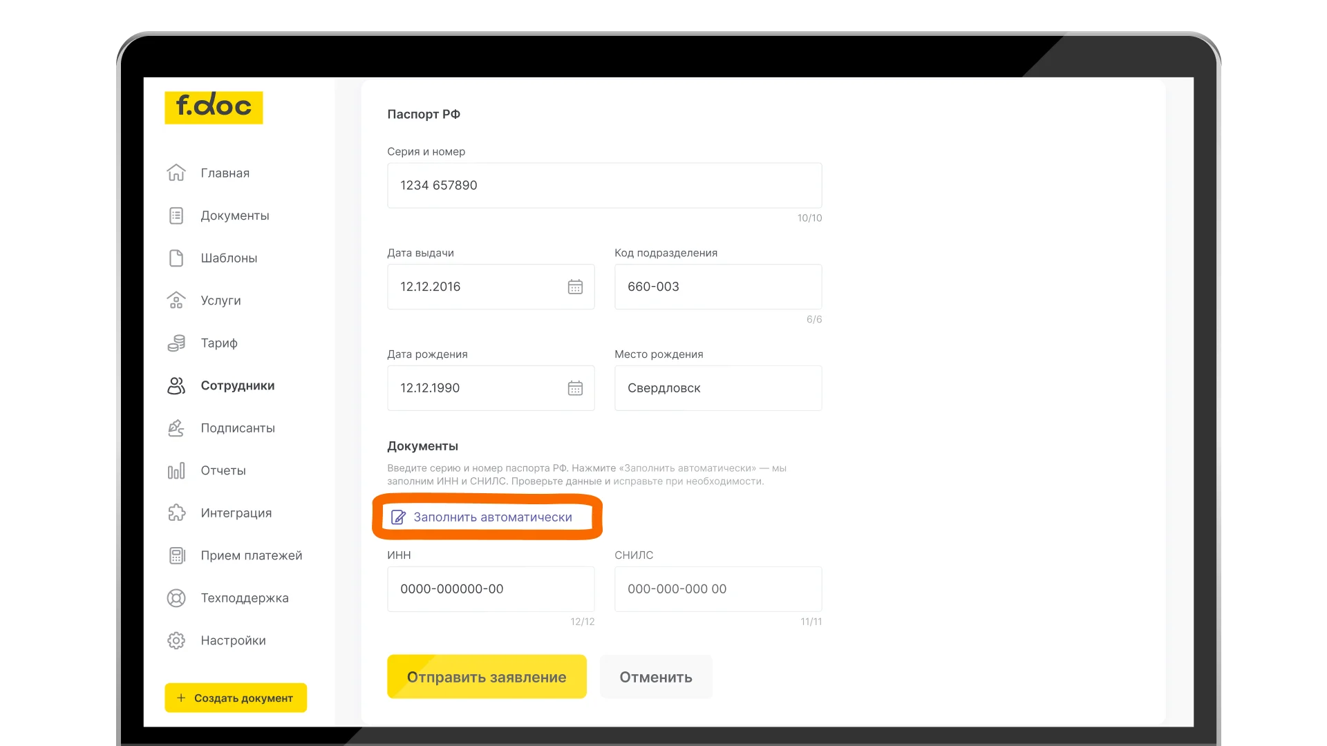 Сотруднику больше не нужно вводить все данные вручную. На форме выпуска КЭП появилась кнопка «Заполнить автоматически». Кнопка становится активной после заполнения всех полей в форме. При нажатии на нее по паспорту подтянутся ИНН и СНИЛС сотрудника.