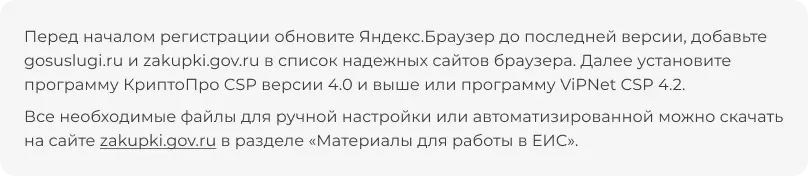 Чтобы не разбираться с настройками компьютера самостоятельно, можно воспользоваться услугами специалистов по сопровождению торгов для прохождения регистрации в ЕИС.