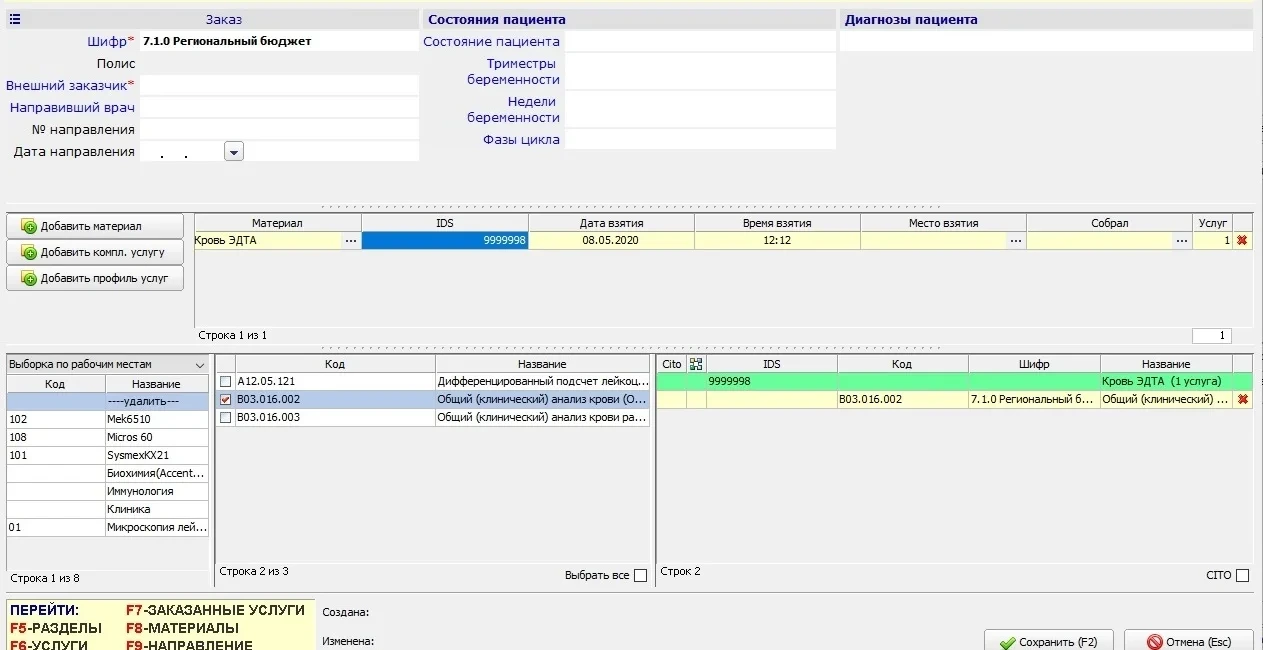 - Регистратура: ведение карты пациента, оформление заказа с присвоением каждому биоматериалу уникального идентификатора в виде штрих-кода.
