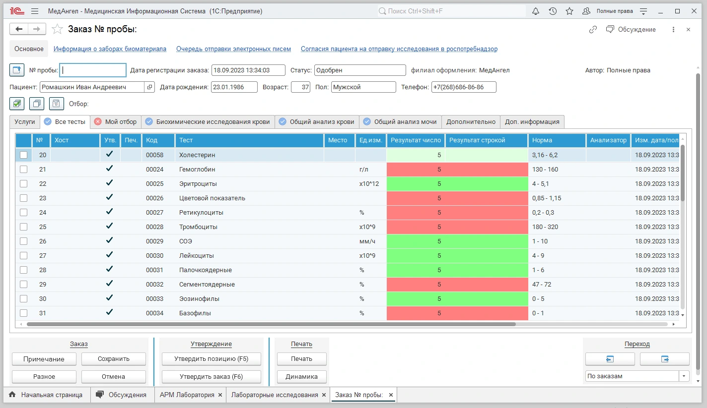 - АРМ лаборанта: контроль результатов автоматических анализаторов, возможность ввода данных для ручных методик, валидация результатов.