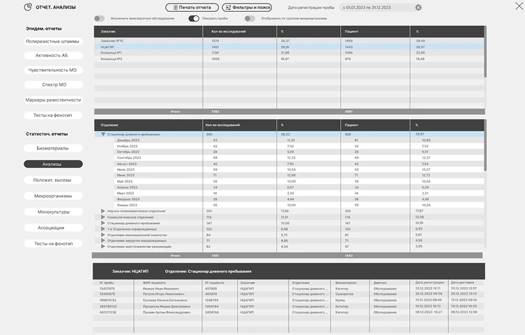 - аналитика, конфигурируемая в различных разрезах (по образцам, тестам, по дате, по докторам и т. д.).