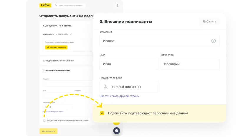 1. Сотрудник компании загружает в сервис документ для электронного подписания, указывает данные клиента и помечает, что подписанту необходимо их подтвердить.