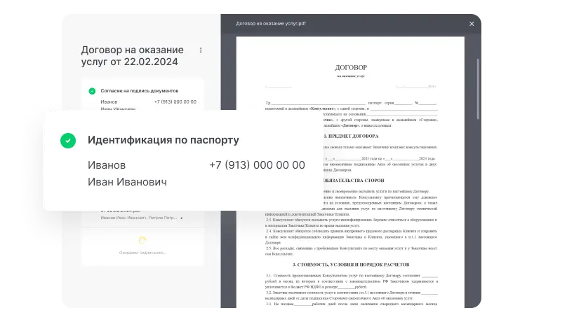 В случае если данные паспорта с фотографии не совпадут с ФИО клиента, которые указала компания, сервис покажет это расхождение сотруднику организации и не даст клиенту подписать электронный документ, пока компания не подтвердит корректность данных.